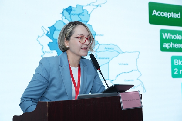 哥伦比亚红会血库医学主任及罗萨里奥大学生物医学科学系医学与健康科学学院职业副教授Dr. Adriana Urbina发表了《哥伦比亚血筛的方法、现状和未来趋势》主题报告。她从哥伦比亚医疗制度及血站分布入手,探讨了当前血筛项目的筛查方法及其挑战,强调了血筛核酸检测具有优越性,能广泛识别病原体突变株,降低感染风险,确保血液安全。同时,她提出了利用分子方法学筛查虫媒病毒等创新思路,并对PA电子生物分子血筛检测方案高度赞赏。